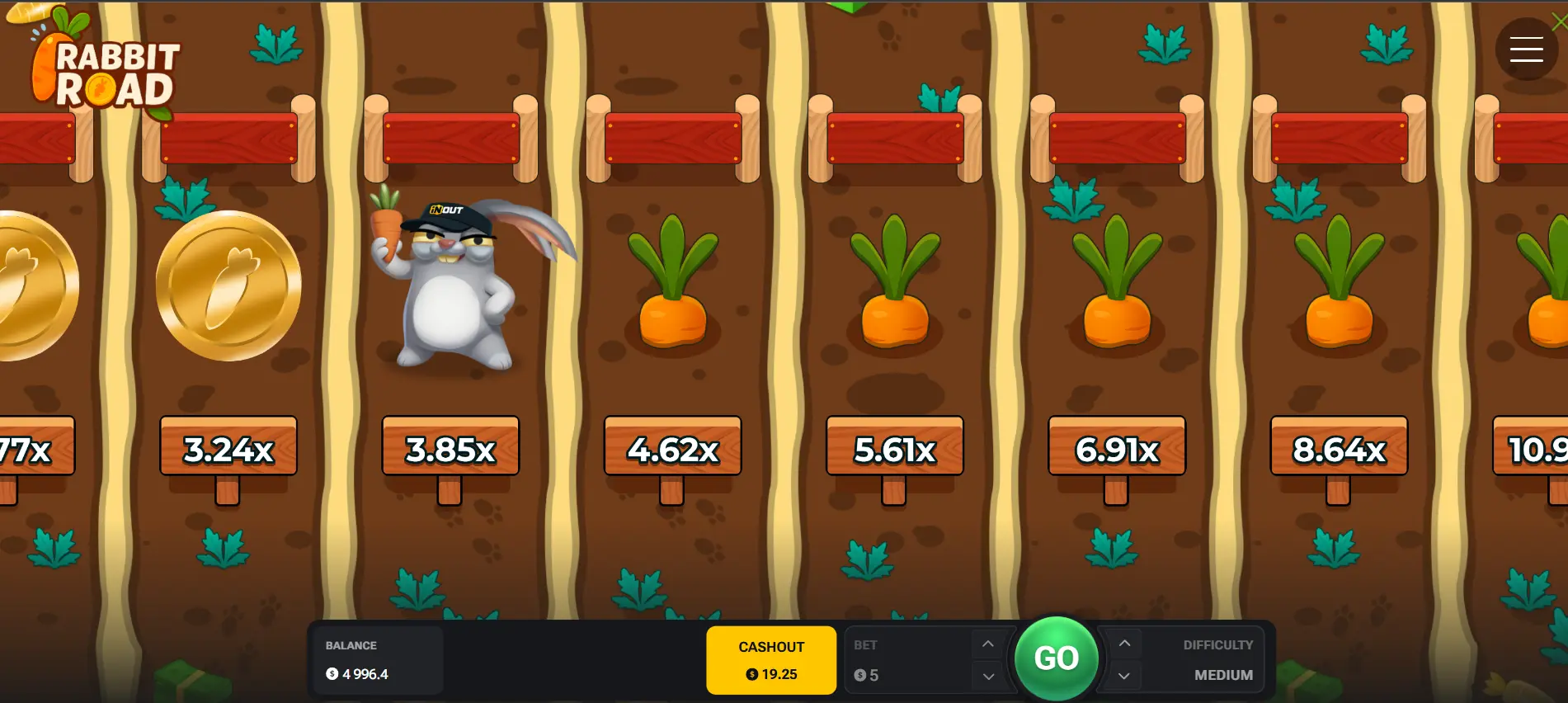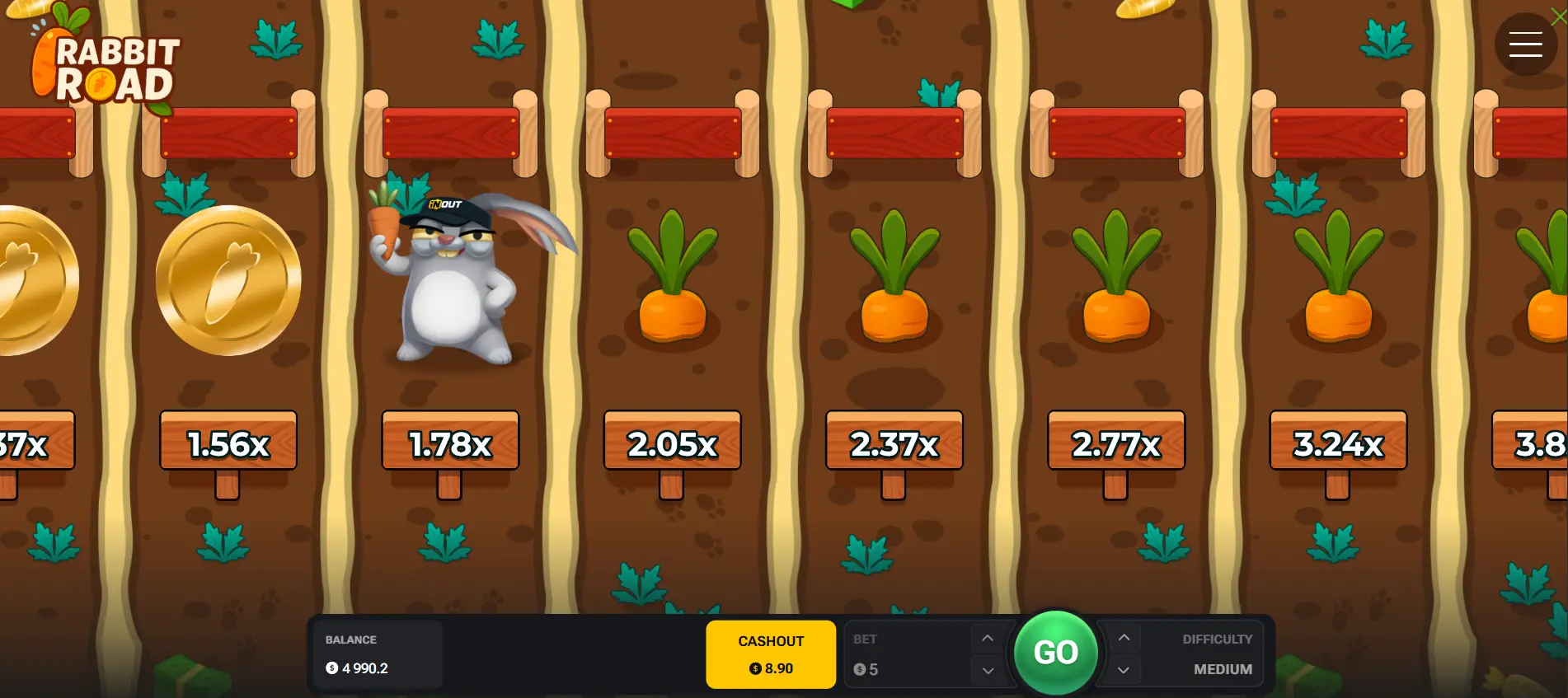 Rabbit Road 2 is not optimized for short, high-frequency sessions. Its volatility model favors deeper runs where variance has room to unfold.